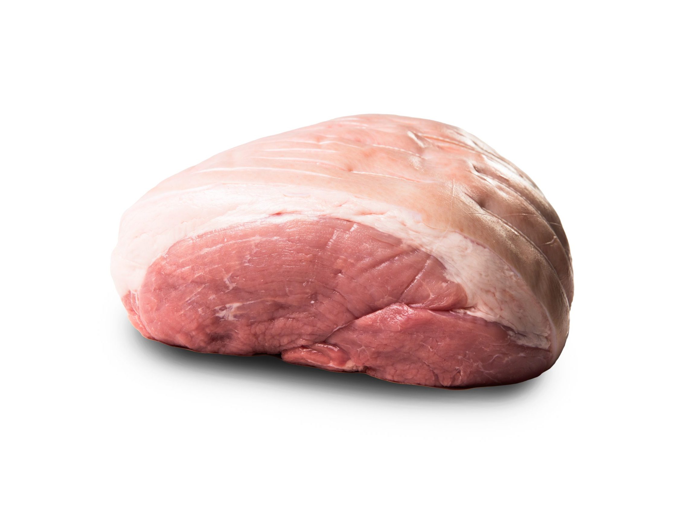 Small boneless leg roast portions, rind/skin on, scored and tied for roasting, chilled, individually vacuum sealed.