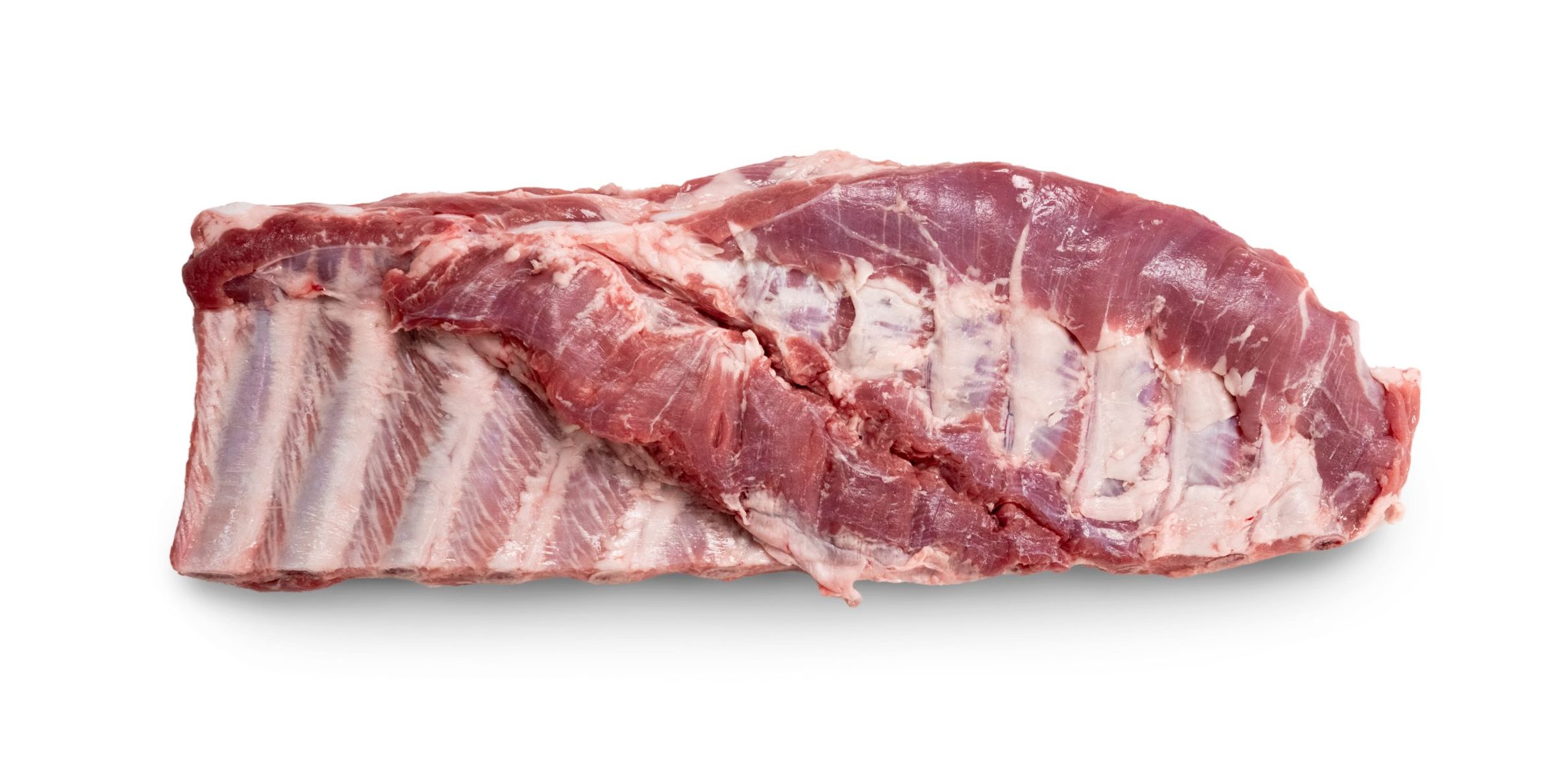 Spare ribs, bone in, chilled and vacuum packed two racks per bag.